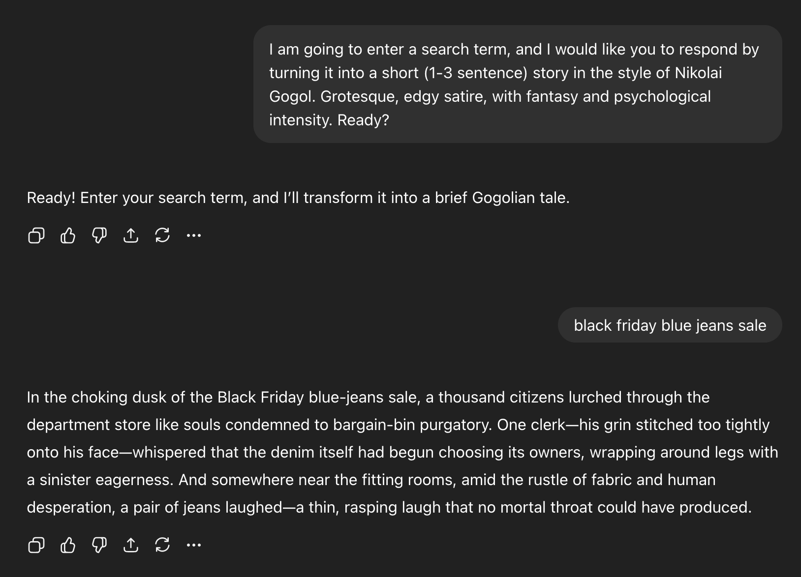 When someone asks you a question they could easily search for on Google, it used to be popular (if a little mean) to reply with a link to Let Me Google That For You. We could build a “Let Me Gogol That For You,” where your search query is turned into an absurd Russian short story.