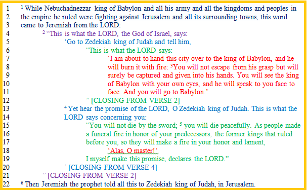 For some reason, I like coming across places in literature where the author has to nest quotes a bunch. I noticed the other day that if you were writing something where you needed to quote Genesis 32:4 (just that one verse!), you would need 4 levels of quotation marks.